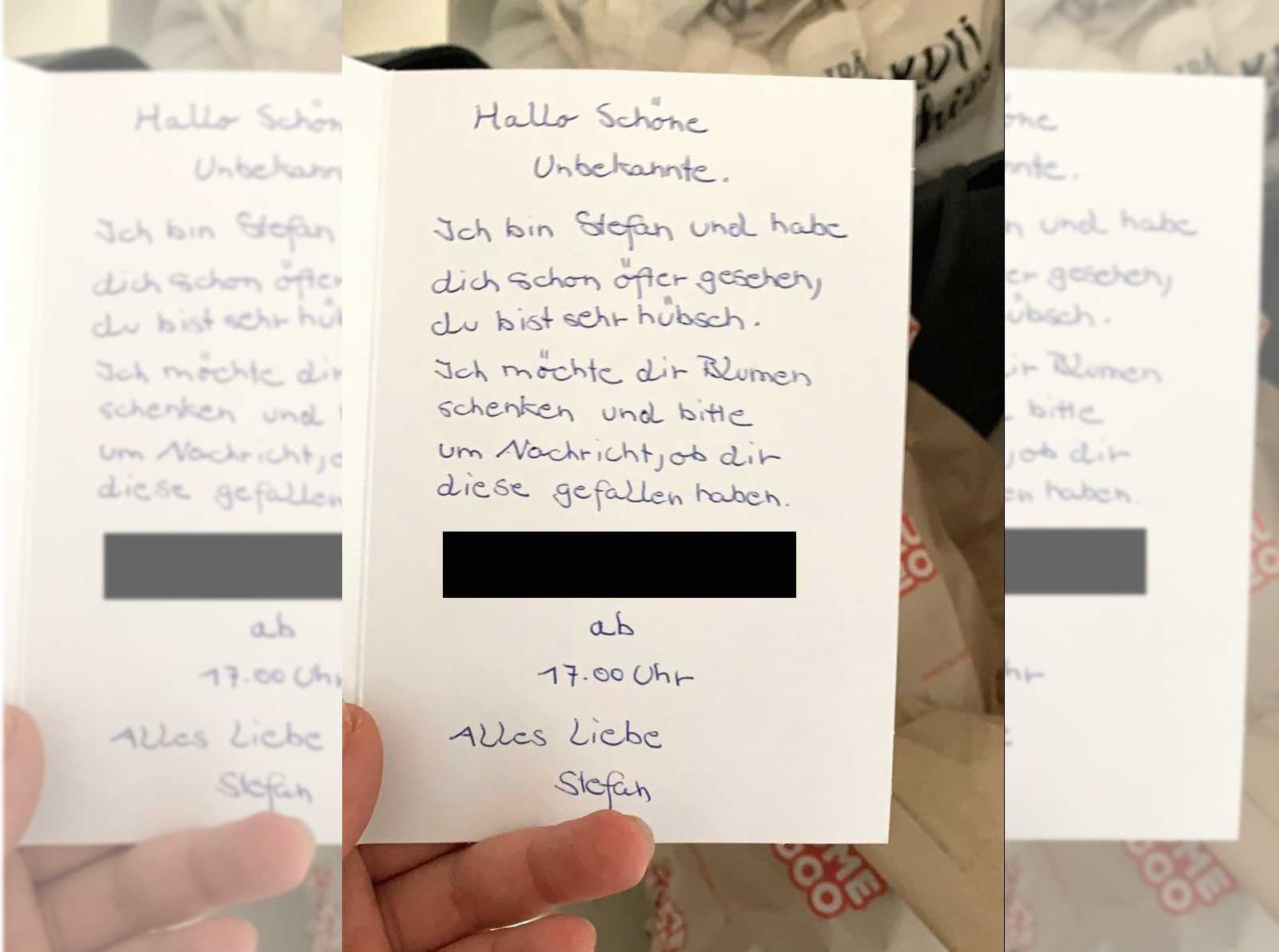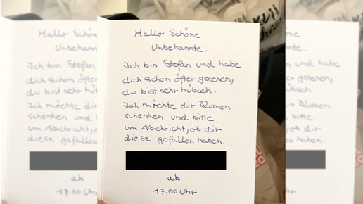 Er überreicht ihn der Auszubildenden mit den Worten „von einem jungen Mann“. Die junge Frau ist perplex: „Im ersten Moment dachte ich die Blumen seien von meinem Freund. So einen Strauß habe ich bisher noch nie bekommen!“ Doch dann entdeckt sie einen Brief. „Hallo schöne Unbekannte. Ich bin Stefan und habe dich schon öfter gesehen. Du bist sehr hübsch. Ich möchte dir Blumen schenken und bitte um Nachricht, ob dir diese gefallen haben.“