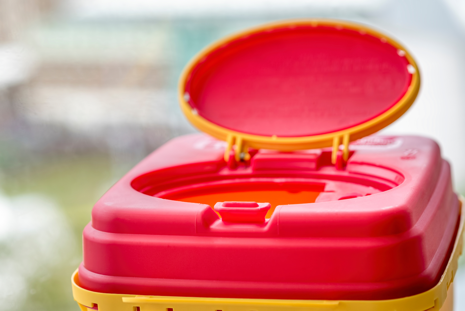 In den Beratungsecken finden sich bislang sogenannte „Kanüleneimer“. In die meist gelb-schwarz oder gelb-rot gefärbten Plastikbehälter werden Lanzetten und Tupfer, die zur Blutzucker-Testung benötigt wurden, entsorgt.