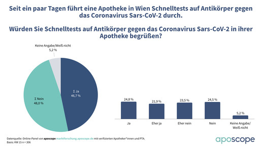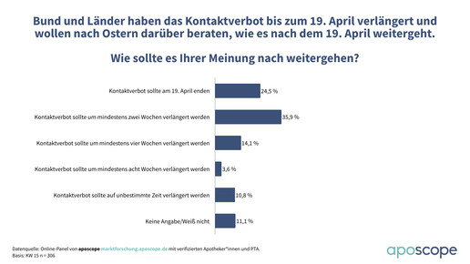 In Bezug auf Schnelltests auf Antikörper gegen Sars-CoV-2 nach österreichischem Vorbild ist das Apothekenpersonal gespalten: Knapp die Hälfte der Befragten (47 Prozent) würde solche Tests in ihrer Apotheke begrüßen, während die andere Hälfte (48 Prozent) dies ablehnt. Um den Anstieg der Infektionszahlen weiter zu verlangsamen, sprechen sich 50 Prozent der Umfrageteilnehmer für eine Verlängerung des Kontaktverbotes um zwei bis vier Wochen aus. Außerdem wünscht sich mehr als die Hälfte (53 Prozent) eine Mundschutzpflicht beim Einkaufen.