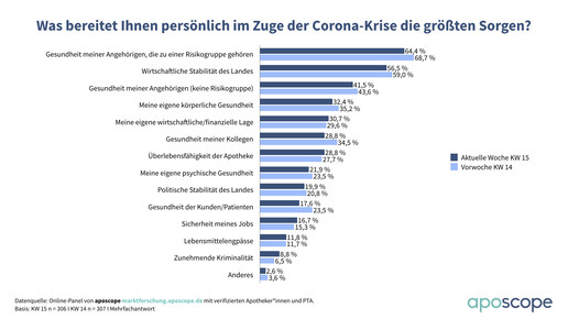 Auch wenn die Existenzangst unter den Apothekenteams wächst, gilt ihre größte Sorge weiterhin anderen: Knapp zwei Drittel (64 Prozent) der Befragten sind derzeit am häufigsten um die Gesundheit von Angehörigen aus einer Risikogruppe besorgt. An zweiter Stelle folgt die Sorge um die wirtschaftliche Stabilität Deutschlands (56 Prozent). Weiteren 32 Prozent bereitet die eigene körperliche Gesundheit Sorgen. Zudem befürchten mehr als drei Viertel (78 Prozent) des Apothekenpersonals, dass sich das Coronavirus in den nächsten Wochen weiter massiv ausbreiten wird. Zwei Drittel (66 Prozent) gehen außerdem von vielen Todesopfern in Deutschland aus, auch wenn diese Befürchtungen im Vergleich zur Vorwoche (82 Prozent sowie 70 Prozent) leicht zurückgegangen sind.