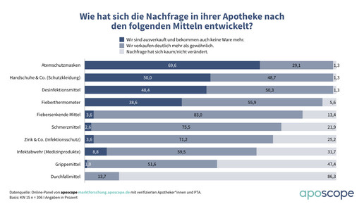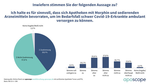 In Apotheken werden weiterhin vor allem fiebersenkende Mittel (83 Prozent) sowie Schmerzmittel (76 Prozent) stark nachgefragt. Zur Behandlung von Covid-19-Erkrankungen kommen auch Opiate wie Morphin oder Sedativa infrage. Eine unlängst empfohlene Bevorratung mit entsprechenden Medikamenten hält allerdings die Mehrheit der Befragten (58 Prozent) derzeit nicht für sinnvoll. Für die Hälfte der Apotheker und PTA ist eine Bevorratung mit Morphin (50 Prozent) und Fentanyl (47 Prozent) derzeit kein Thema, bei Sufentanil (73 Prozent), Remifentanil (71 Prozent) und Midazolam (61 Prozent) ist der Anteil sogar noch höher.