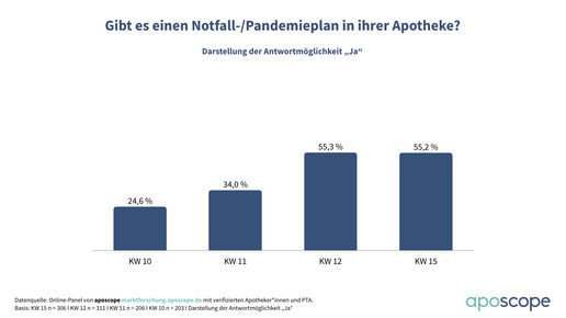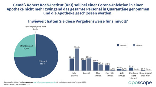 Die gute Nachricht: Gemäß dem RKI ist es im Falle einer Infektion in der Apotheke nicht zwingend notwendig, alle Mitarbeiter unter Quarantäne zu stellen und die Offizin zu schließen. Stattdessen könne der Betrieb und damit die pharmazeutische Versorgung unter gewissen Voraussetzungen aufrechterhalten werden. Dieses Vorgehen stößt bei drei Viertel aller Befragten (75 Prozent) auf Zustimmung. Dabei ist der Zuspruch unter den befragten Inhabern am größten (97 Prozent).