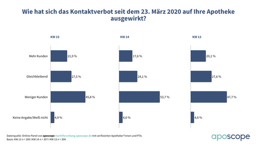 Der Kundenansturm, den viele Apotheken zu Beginn der Corona-Pandemie verzeichnen konnten, gehört durch das Kontaktverbot inzwischen vielerorts der Vergangenheit an. Während die Hälfte der Befragten (49 Prozent) von einer gleichbleibenden oder sogar steigenden Kundenanzahl berichtet, ist für 46 Prozent ein Kundenrückgang spürbar. In der Folge kamen bereits in der Vorwoche (Kalenderwoche 14) Maßnahmen wie flexible Arbeitszeiten (30 Prozent), Überstundenabbau (22 Prozent) oder Kurzarbeit (8 Prozent) zum Tragen. Hinzu kommen bei rund einem Drittel der Umfrageteilnehmer Sorgen um die eigene wirtschaftliche beziehungsweise finanzielle Lage (31 Prozent) bis hin zum wirtschaftlichen Überleben der Apotheke (29 Prozent).