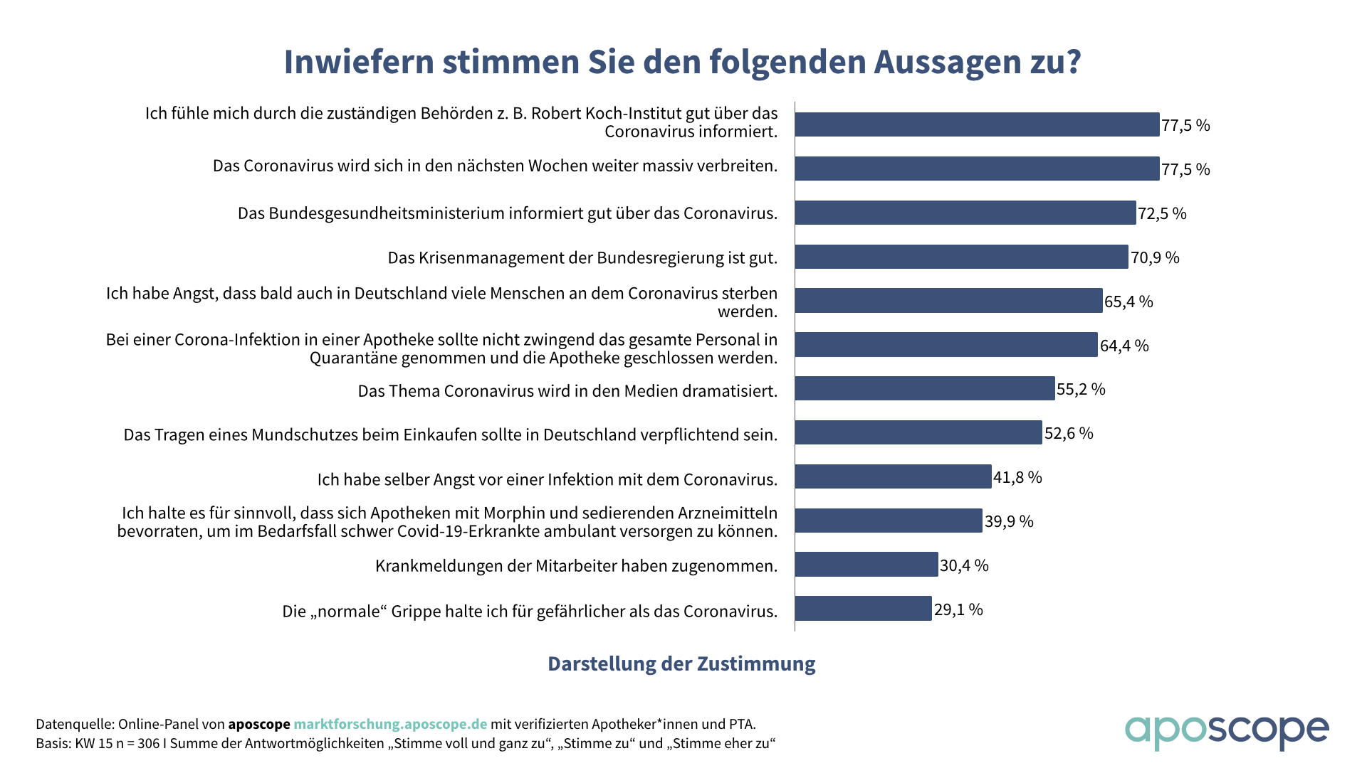 aposcope befragt seit dem 25. Februar 2020 jede Woche verifizierte Apotheker und PTA online zum Thema Coronavirus. An der aktuellen Umfrage zur „Zahl der Woche“ nahmen am 7. April 2020 insgesamt 306 Apotheker und PTA teil. Die Umfrage ist repräsentativ für die deutsche Apothekenlandschaft.