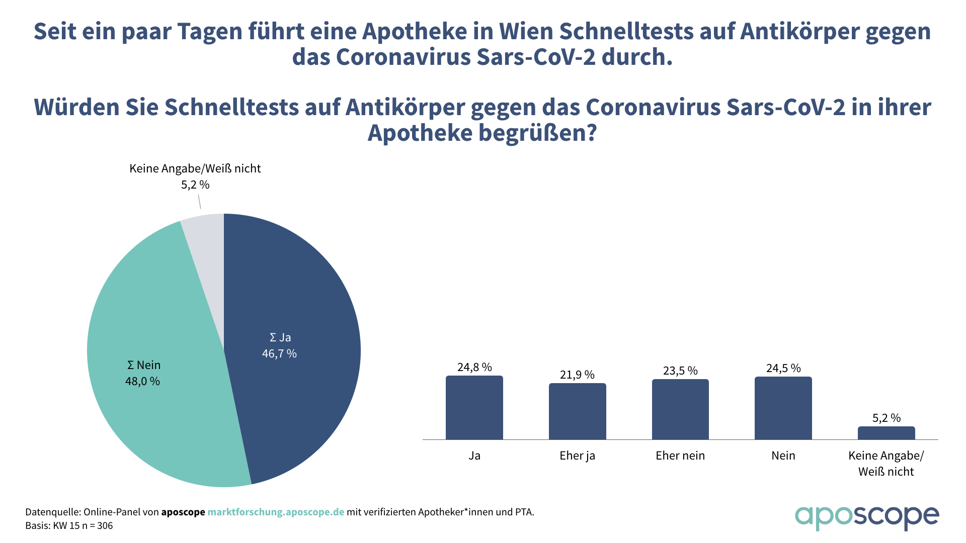 In Bezug auf Schnelltests auf Antikörper gegen Sars-CoV-2 nach österreichischem Vorbild ist das Apothekenpersonal gespalten: Knapp die Hälfte der Befragten (47 Prozent) würde solche Tests in ihrer Apotheke begrüßen, während die andere Hälfte (48 Prozent) dies ablehnt. Um den Anstieg der Infektionszahlen weiter zu verlangsamen, sprechen sich 50 Prozent der Umfrageteilnehmer für eine Verlängerung des Kontaktverbotes um zwei bis vier Wochen aus. Außerdem wünscht sich mehr als die Hälfte (53 Prozent) eine Mundschutzpflicht beim Einkaufen.