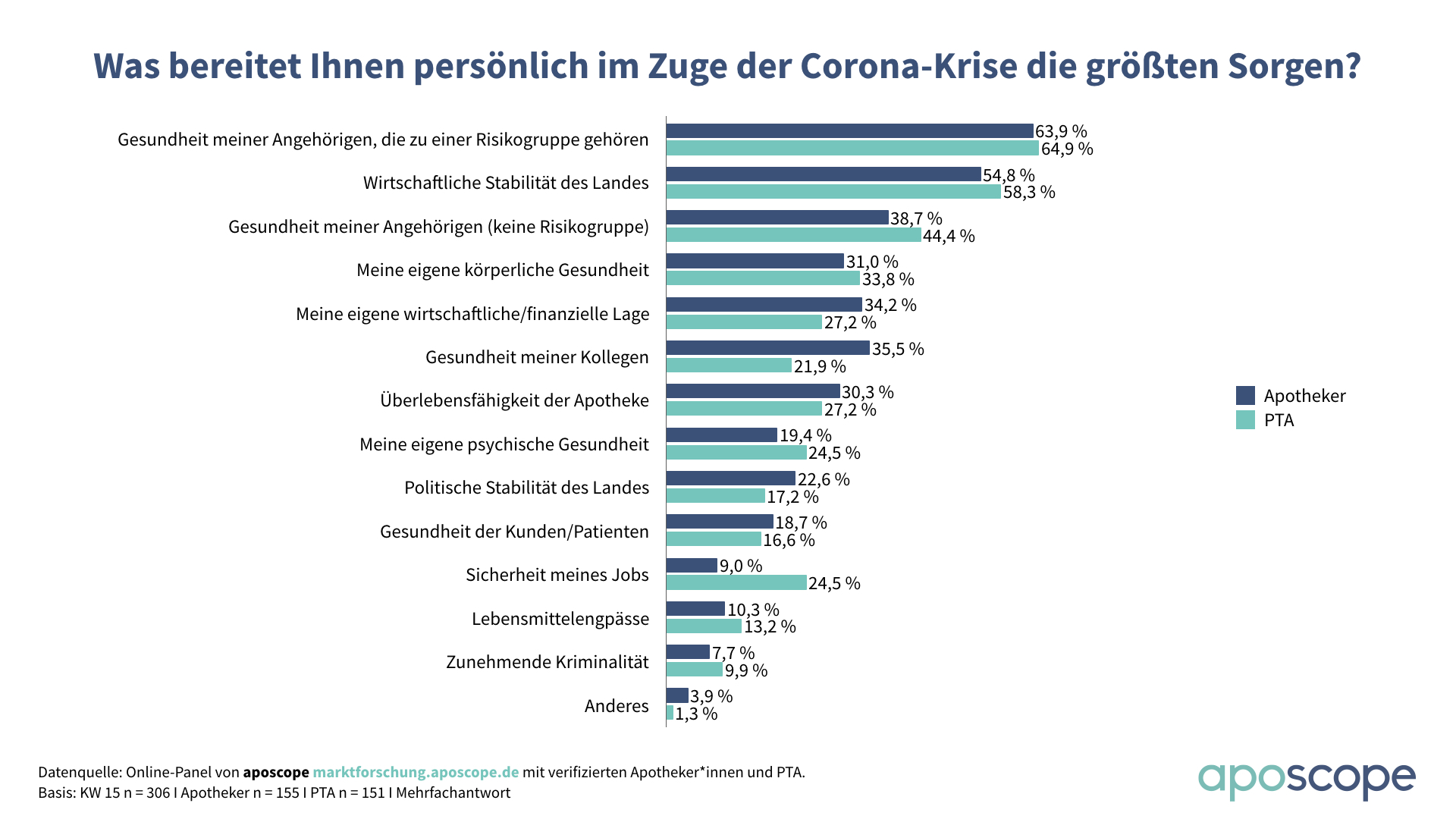 Auch wenn die Existenzangst unter den Apothekenteams wächst, gilt ihre größte Sorge weiterhin anderen: Knapp zwei Drittel (64 Prozent) der Befragten sind derzeit am häufigsten um die Gesundheit von Angehörigen aus einer Risikogruppe besorgt. An zweiter Stelle folgt die Sorge um die wirtschaftliche Stabilität Deutschlands (56 Prozent). Weiteren 32 Prozent bereitet die eigene körperliche Gesundheit Sorgen. Zudem befürchten mehr als drei Viertel (78 Prozent) des Apothekenpersonals, dass sich das Coronavirus in den nächsten Wochen weiter massiv ausbreiten wird. Zwei Drittel (66 Prozent) gehen außerdem von vielen Todesopfern in Deutschland aus, auch wenn diese Befürchtungen im Vergleich zur Vorwoche (82 Prozent sowie 70 Prozent) leicht zurückgegangen sind.