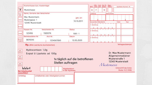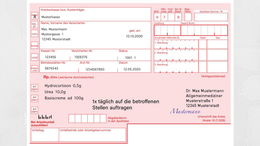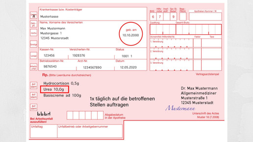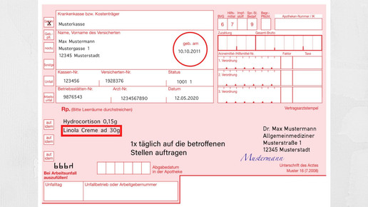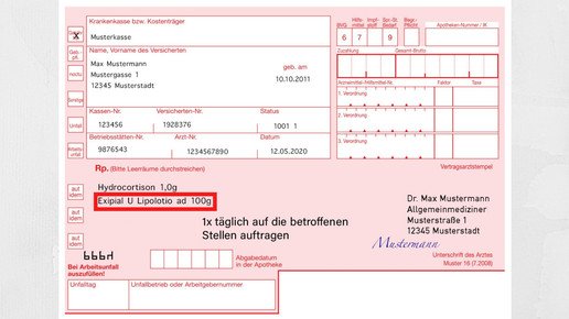 In dieser Rezeptur ist das Cortison mit 0,5 Prozent so niedrig verordnet, dass sie auf einem Muster-16 Formular für einen Erwachsenen nicht abgabefähig ist. Erst bei Konzentrationen von 1 Prozent ist der Arzneistoff verschreibungspflichtig. Wird Hydrocortison mit weiteren Wirkstoffen kombiniert, so kann eine Abgabe zu Lasten der GKV erolgen. Beispielsweise ist dies der Fall, wenn das Gluccocorticoid – auch in geringern Dosen unter 1 Prozent – mit einem verschreibungspflichtigen Antibiotikum kombiniert wird. Auch bei der Kombination mit einem Stoff aus der OTC-Ausnahmeliste ist eine Abgabe auf rosa Rezept möglich. Zu einem dieser Stoffe gehört Harnstoff.