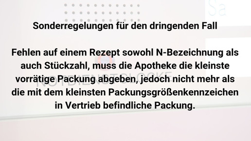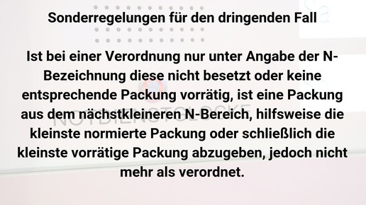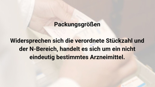 Ist die N-Bezeichnung angegeben, stehen alle Packungen aus dem N-Bereich zur Auswahl. Ist die Stückzahl verordnet und entspricht diese einem N-Bereich, können alle Packungen aus dem normierten Bereich bei der Abgabe berücksichtigt werden. Entspricht die verordnete Stückzahl keinem Normbereich, kann ausschließlich zwischen Packungen der identischen Stückzahl gewählt werden.