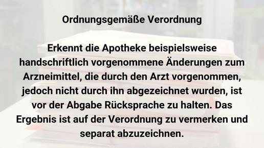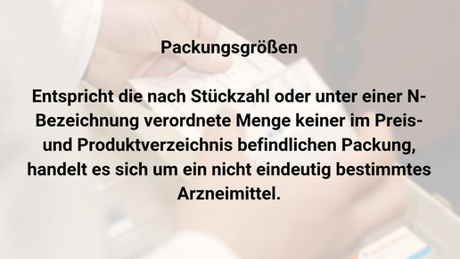 Die Verordnung eines nicht eindeutigen Arzneimittels liegt vor, wenn zur angegebenen Stückzahl oder N-Bezeichnung kein Arzneimittel im Produktverzeichnis gelistet ist. Gleiches gilt, wenn Stückzahl und N-Bereich angegeben sind, aber die Stückzahl nicht im angegebenen Normbereich liegt. In diesen Fällen darf keine Abgabe stattfinden, ohne zuvor Rücksprache mit dem Arzt zu halten. Die Apotheke darf dann eine Änderung/Korrektur auf der Verordnung vornehmen und dies auf dem Rezept dokumentieren und abzeichnen.