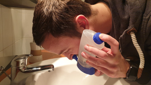 Vor jedem Gebrauch sollte die Nasendusche gründlich ausgespült werden. Anschließend wird sie mit der fertigen isotonischen Kochsalzlösung oder alternativ mit handwarmem Wasser befüllt und ein Salzbeutel im Wasser durch Schwenken gelöst. Sind keine Salzrückstände mehr vorhanden, kann die Nasenspülung beginnen: Dazu sollte man sich leicht nach vorne über das Waschbecken beugen. Anschließend wird die Nasendusche an einem Nasenloch angesetzt. Besitzt die Nasendusche ein Ventil, muss dieses nun geöffnet werden. Während des gesamten Spülvorgangs sollte der Mund weit geöffnet werden: Dadurch wird verhindert, dass Spülflüssigkeit in den Rachen gelangt.