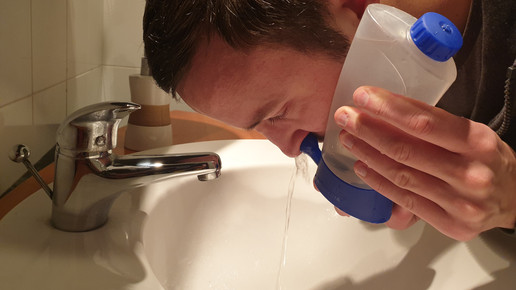 Neben den beiden Varianten können auch Nasenduschen helfen das Sekret zu entfernen: Durch die Spüllösung wird das Sekret verflüssigt und schonend aus der Nase befördert. Am besten geeignet ist isotonische Kochsalzlösung. In einer solchen Lösung ist die gleiche Menge an Elektrolyten enthalten wie in den Körperflüssigkeiten. Zu niedrig oder zu hoch dosierte Lösungen können die empfindliche Nasenschleimhaut reizen: Es kann dann zu einem unangenehmen Brennen kommen. Daher sollte auch das Spülen mit Leitungswasser vermieden werden. Am besten geeignet sind fertige isotonische Kochsalzlösung aus der Apotheke oder spezielle Beutel mit einer fertig abgepackten Salzmenge, die in Wasser aufgelöst werden. Zur Anschließenden Pflege der Schleimhäute kann beispielsweise GeloSitin Nasenpflege verwendet werden.