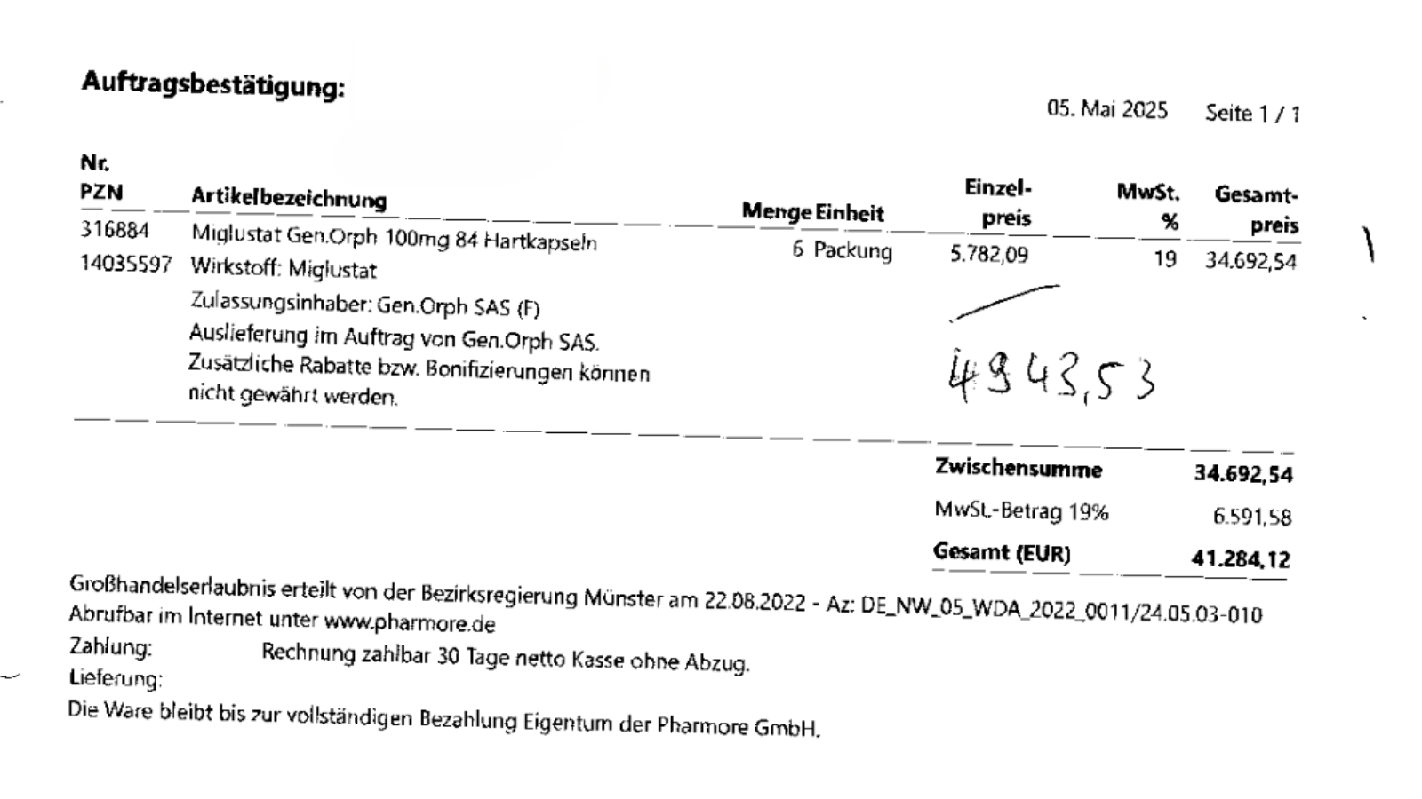 Im aktuellen Fall wurde für 84 Hartkapseln Miglustat 100 mg ein Einzelpreis von 5782,09 statt 4943,53 Euro in Rechnung gestellt; bei insgesamt sechs Packungen ergibt sich eine Preisdifferenz von rund 6500 Euro. „Es gab zum 1. Mai eine Preissenkung. Unser Auftrag ist auf den 3. Mai datiert. Das steht auch so auf der Auftragsbestätigung“, stellt der Apotheker klar. Pharmore habe den Fall am 5. Mai bearbeitet. „Wir haben klar im Mai zum neuen Preis bestellt.“ Der Inhaber vermutet: „Also entweder versuchen sie es einfach oder sie müssen tatsächlich in der internen EDV – da habe ich natürlich keinen Einblick – Preisänderungen manuell eintragen.“