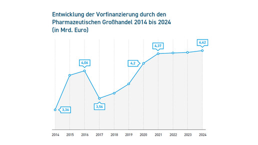 Eine wichtige, nicht hinreichend beachtete Funktion des vollversorgenden Pharmagroßhandels habe in den vergangenen Jahren an Bedeutung gewonnen: die Vorfinanzierung der von Apotheken abgegebenen Medikamente. Großhändler seien Eigentümer der Ware. Beim Verkauf gewährten sie ihren Kunden, den Apotheken, häufig flexible Zahlungsziele. Dies führe dazu, dass Apotheken in vielen Fällen ihre Ausstände gegenüber dem Großhandel erst dann begleichen müssten, wenn sie ihr Geld bereits von der Krankenkasse erhalten hätten. Der Großhandel sichere auf diese Weise die Waren- und Zahlungsströme ab.