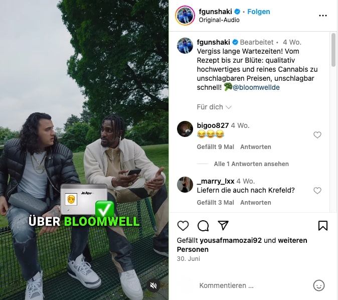 „Dieses Apothekenunkraut da, das ist doch viel zu teuer“, heißt es in einem Bloomwell-Werbeclip des Rappers „fgunshaki“, der auf Instagram kursiert. Anders als beim Dealer komme man schnell und zuverlässig an sein Cannabis. Hierbei sieht sich Bloomwell selbst nicht als moderner Dealer. „Das Video zeigt unserer Ansicht nach, dass Patient:innen mit chronischen Beschwerden eben nicht auf den illegalen Markt ausweichen müssen und sollten“, erklärt Bloomwell. „Ein Großteil der Menschen, die illegal Cannabis erwerben und konsumieren, macht dies aus gesundheitlichen Gründen. Wir plädieren dafür, dass diesen Menschen der Zugang zur ärztlich begleiteten Therapie ermöglicht wird“, stellt Bloomwell klar. Ungeachtet dessen sei das Unternehmen für den Inhalt des Reels redaktionell nicht verantwortlich.