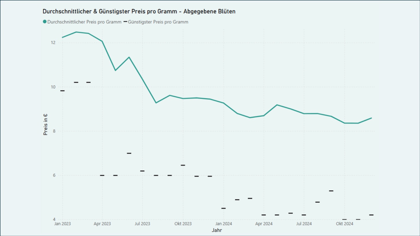 Die Untersuchung zeigt, dass die Cannabispreise mit der neuen Gesetzeslage zunächst kurzfristig gestiegen seien, seitdem jedoch kontinuierlich gefallen wären. Im vierten Quartal 2024 hätten sie einen neuen Tiefpunkt erreicht. Im Oktober und November lagen die günstigsten Preise für ein Gramm medizinisches Cannabis laut Bloomwell jeweils bei 3,99 Euro. Der Durchschnittspreis fiel im November auf 8,35 Euro pro Gramm – ein Rückgang im Vergleich zu 9,27 Euro im Januar desselben Jahres. „Patient:innen können sich heutzutage in Deutschland wahrscheinlich so günstig versorgen, wie in keinem anderen Land weltweit“, heißt es im Barometer.