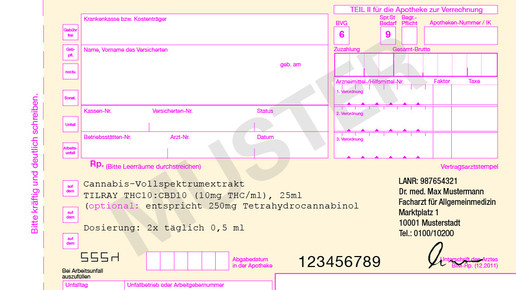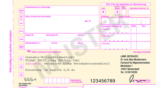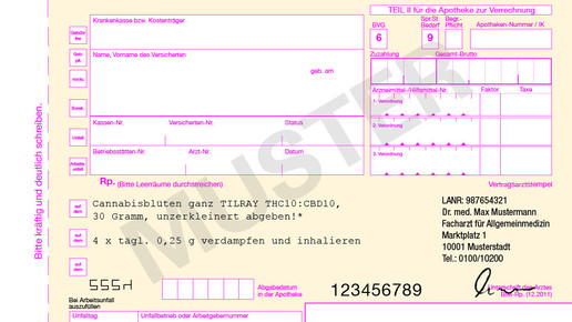 Höchstmenge: 1000 mg (bezogen auf den ∆9 -Tetrahydrocannabinol-Gehalt) innerhalb von 30 Tagen. Übersteigt die Verordnung die zulässige Höchstmenge, muss das Rezept Ausnahmekennzeichen „A“ aufgebracht werden.